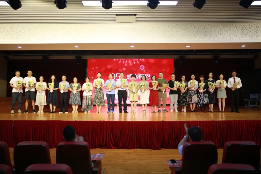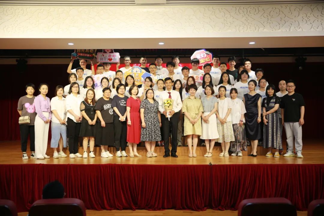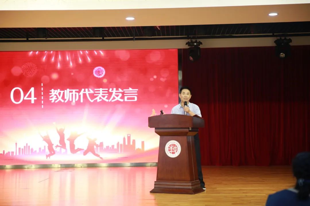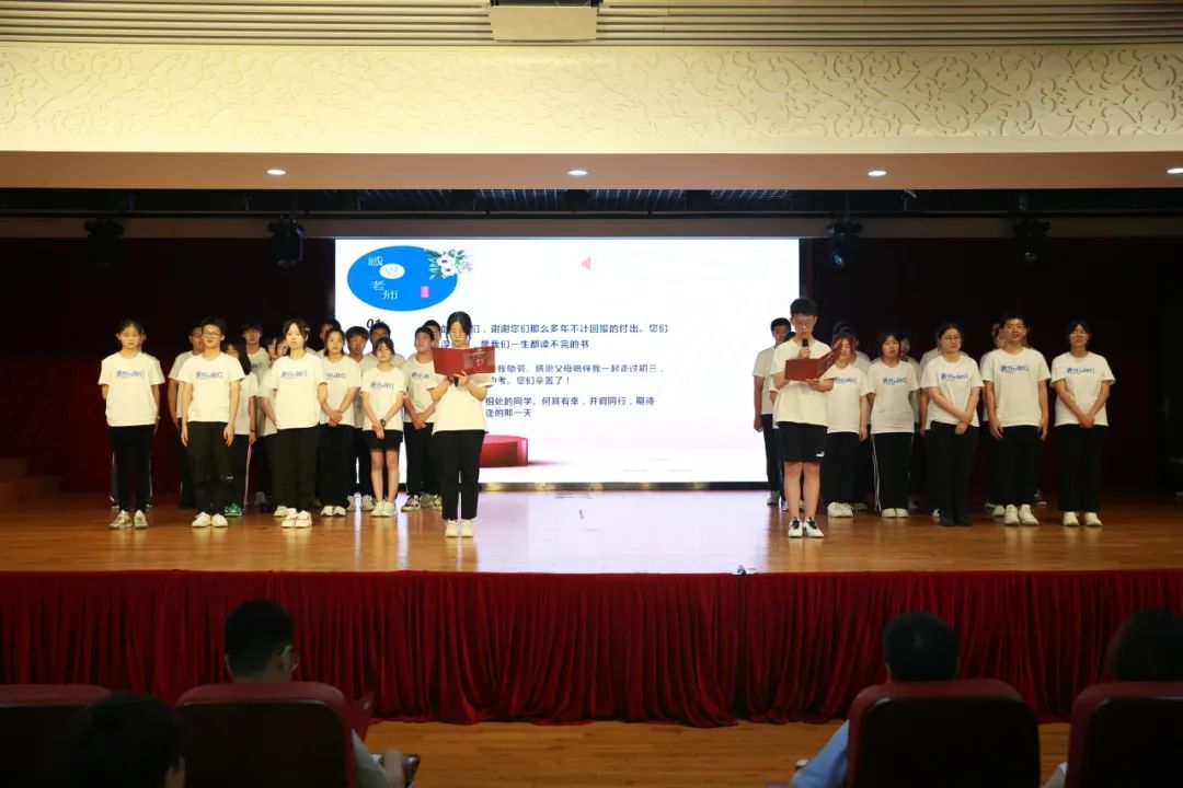 初中四年,在同学们的成长的过程中,老师们都付出了辛勤的汗水。他们用心良苦,他们全力以赴,他们一路陪伴着我们奔赴中考,迎接人生第一次大挑战。九年级教师代表贾汉永老师为学生送上了毕业赠言与祝福。学生代表们为九年级老师送上鲜花,表示感谢。